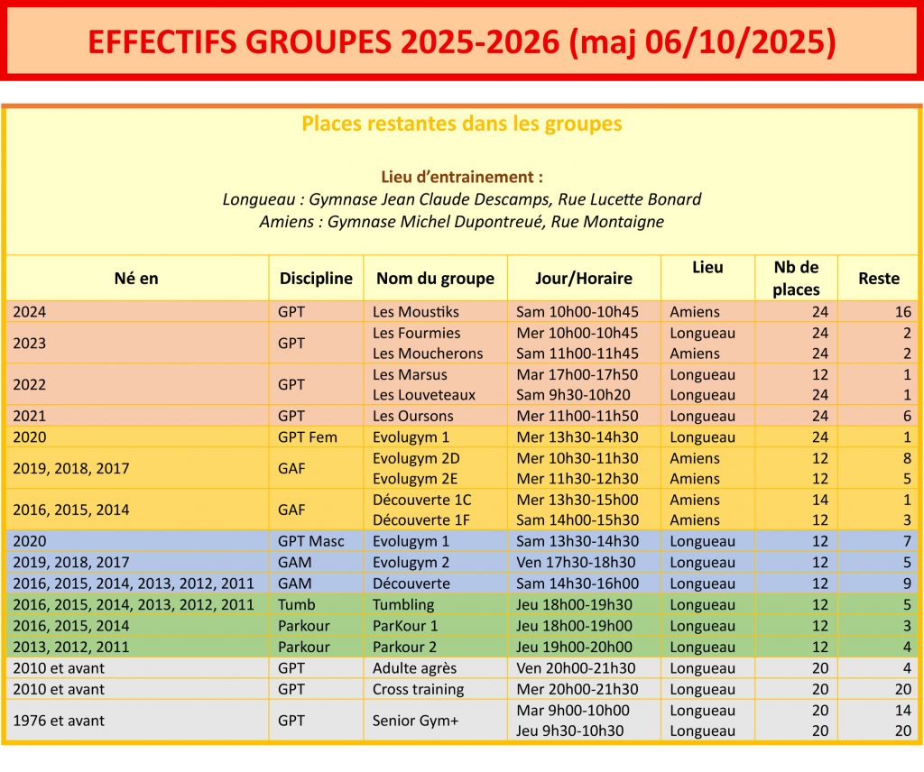 Effectifs et places restantes pour la saison 2025 2026 (maj 06/10/2025)